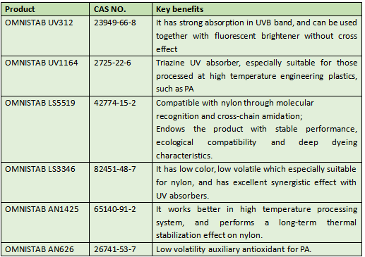 Nylon (PA) material is very sensitive to ultraviolet light in the range of 290-315nm. Therefore, we should choose a UV absorber with strong absorption for UV-B band, and this kind of UV absorber absorption concentration in the UVB band, so as not to affect the use of fluorescent brightening agent in the formula.