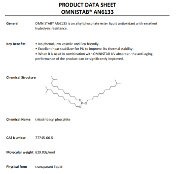 Additionally, the Omnistab AN 6133 can serve as an effective additives and chelating agent in both soft and hard PVC materials. Its inclusion enhances the thermal stability and light stability during processing, thereby preserving the color stability and transparency of the final product. Moreover, it demonstrates remarkable antioxidant properties when applied to ABS, SBS, SIS, SEBS, and other rubber materials.