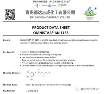 This product is suitable for all kinds of polymers with excellent antioxidant properties.Especially suitable for polyurethane soft foam rubber board, it can prevent polyols from forming peroxides in the storage process, and can also prevent the burning phenomenon in the foaming process.Due to its low volatility and excellent compatibility, it is particularly effective in polyurethane forced air cooling.This feature also prevents fogging of the surfaces of products used in automobiles and the coloring of textiles.This product not only has excellent oxidation resistance but also has the convenience of liquid auxiliaries can be pumped, easy to use and effective mixing.The low volatility and liquid state of the 1135 make it particularly suitable for a single liquid, emulsion, suspension, solution or melt polymer manufacturing process.It is easy to emulsify, and can be dissolved, dispersed or kept pure during processing.They can be added before, during, and after aggregation.The usual recommended dosage for AN1135 is between 0.15% and 0.5%.