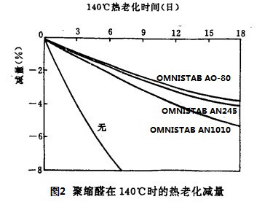 图1是几种常见抗氧剂在PA-6中的使用效果,可以看出AO-80的抗氧效果明显要好于目前广泛使用的AN1098和AN1010。抗氧剂的效果还体现在某些树脂老化时的减量,减量大小反映树脂的氧化程度。图2是不同抗氧剂在聚缩醛中140℃热老化时的减量情况,从图中可以看出,AO-80的性能也明显优于抗氧剂AN1010,略好于AN245。
