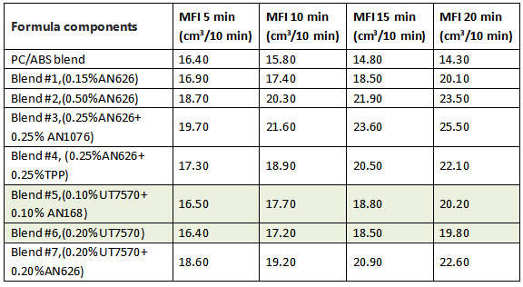 To evaluate the improvement effect of the Omnistab UT7570 on the processing stability of polymers, we conducted multiple extrusions (260℃, 5KG PC/ABS) through a screw extruder. After 10 minutes, 15 minutes and 20 minutes, the melt flow index (MFI) was measured respectively. The change of the melt flow index of the sample relative to the melt flow index under standard conditions was evaluated, and the results are shown in the table below.