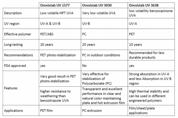 OMNISTAB UV 1577 | OMNISTAB UV 3030 | OMNISTAB UV 3638 | |