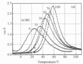 NBR blended vulcanized rubber was prepared by adding AO80, its dynamic mechanical properties were tested by DMTA. Above figure shows that damping dissipated energy(TA)increases as the content of AO80 increases. That means vulcanized rubber’s damping resistance increases as the content of AO80 increases.